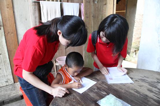 志愿者們在教小朋友們親自填寫表格