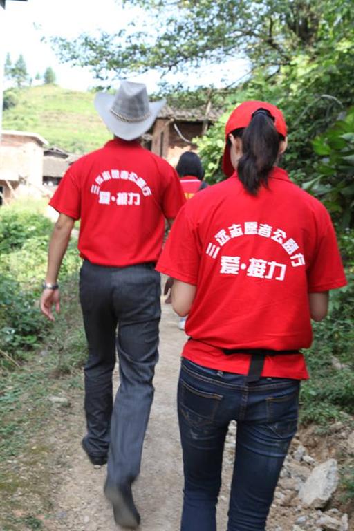 下午14:30分,在午飯并整頓之后,我們頭頂烈日,開始了本次助學公益行動的探訪之旅。11名志愿者被分成3組,由當地北團鎮電力小學的3位老師引路,前往鎮里3個不同方向的鄉村探訪貧困學生家庭。